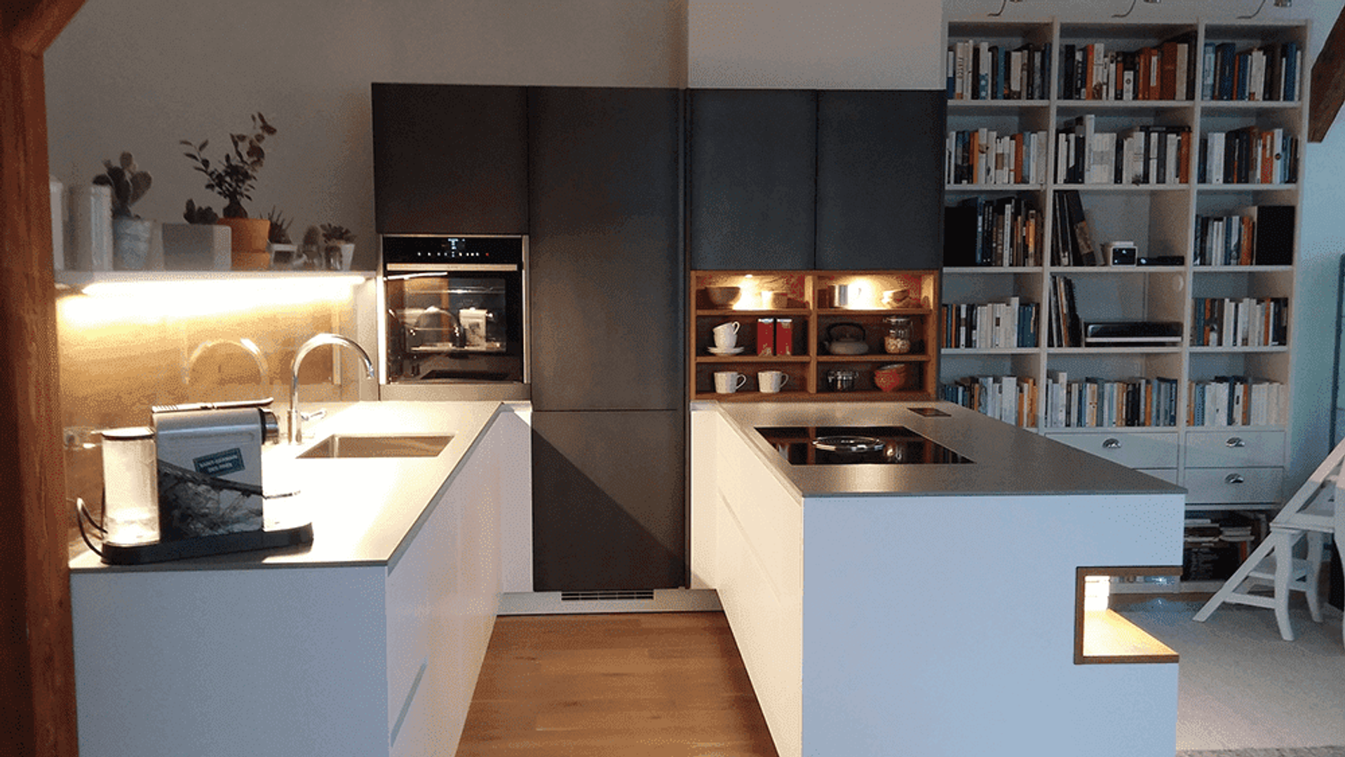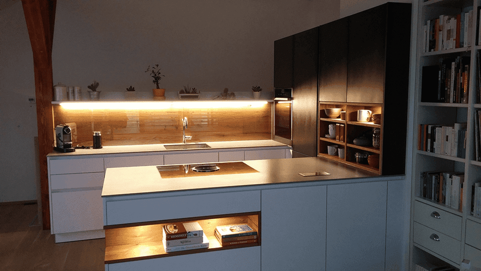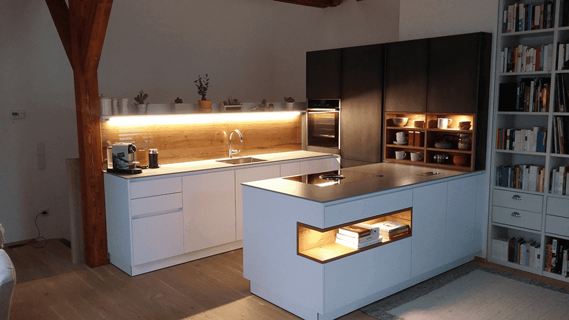 Die Küche verfügt über eine 1.2cm starke Dekton Arbeitsplatte, Hochschränke in Eisenlack, Regale und Rückwand in Alteichenholz sowie Fronten in Arktislack mit pulverbeschichteter Griffleiste.