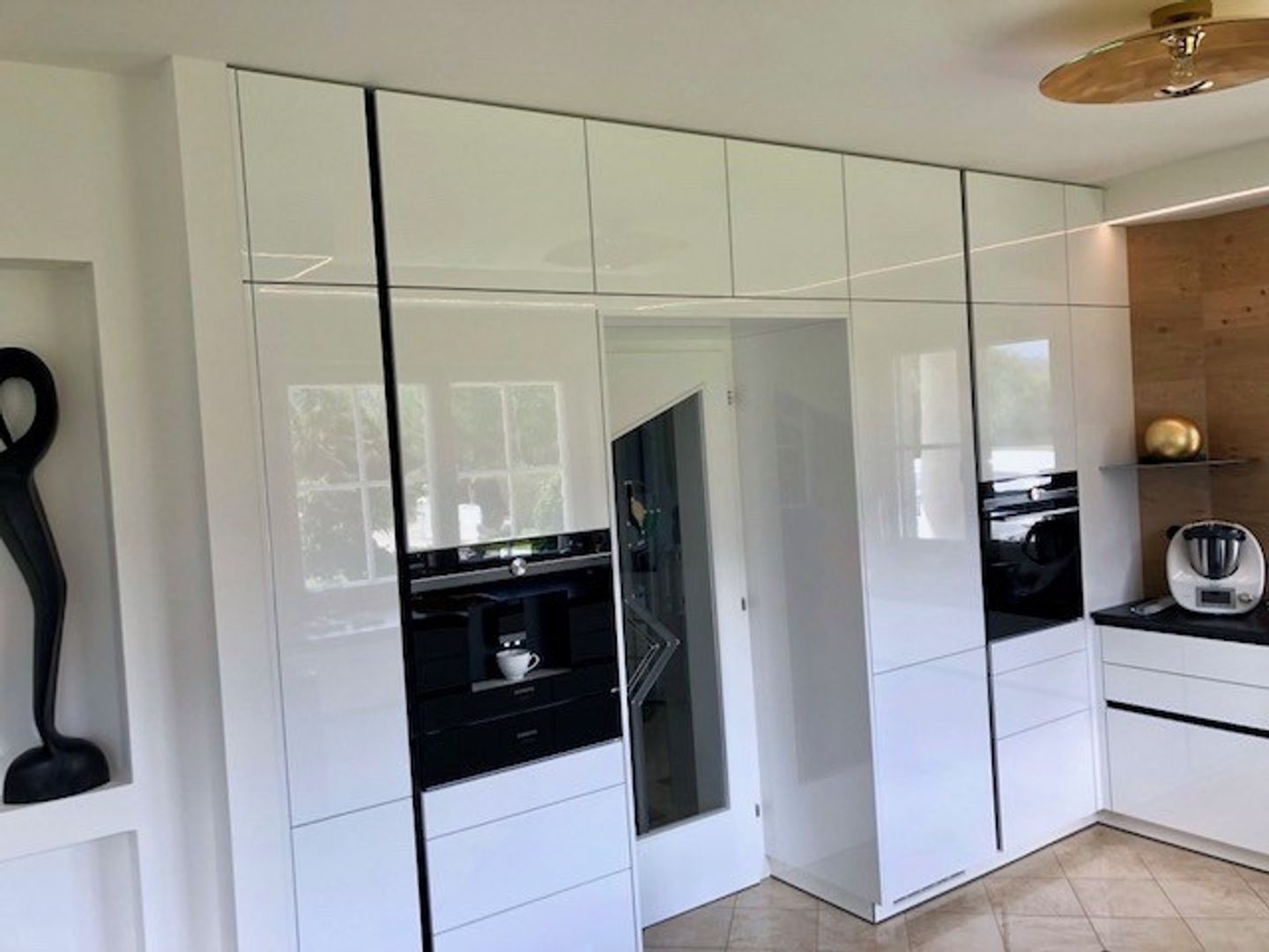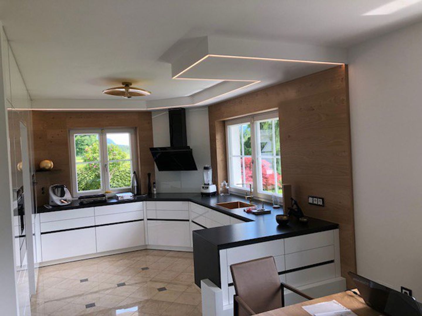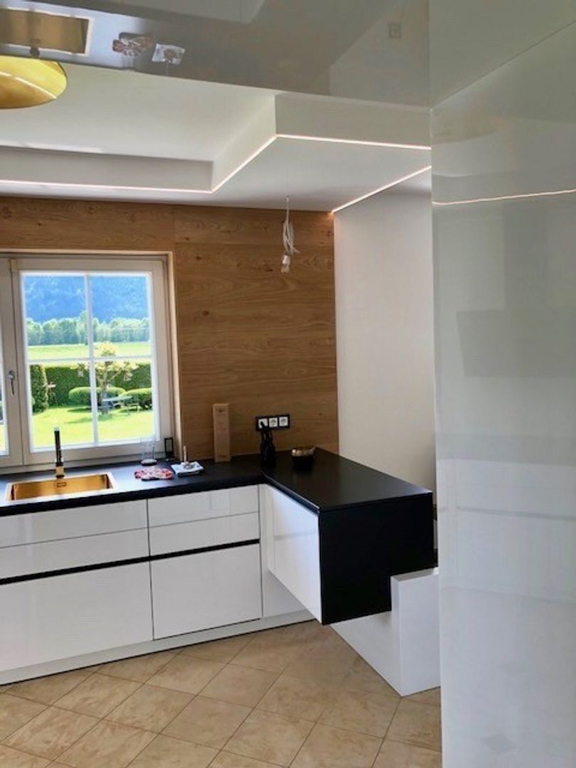 Weiße ewe Lack Hochglanz Küche mit Granitplatte-Lederoptik und Rückwände Eiche furniert mit Beleuchtungsmodul